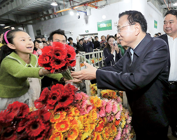 1月23日至25日,新春佳節(jié)前夕,中共中央政治局常委、國務(wù)院總理李克強,在云南省委書記陳豪、省長阮成發(fā)陪同下,在昭通、昆明考察,向各族群眾送上新春祝福。圖為1月24日晚,李克強來到昆明斗南花卉市場考察。總理的到訪,讓斗南花卉市場沸騰了。李克強仔細詢問鮮花品種價格,關(guān)心花農(nóng)收入,還自掏腰包買了兩束花。李克強說:“你們起早貪黑、辛苦勞作,給全國人民送去歡樂和吉祥。我祝福你們春節(jié)快樂!