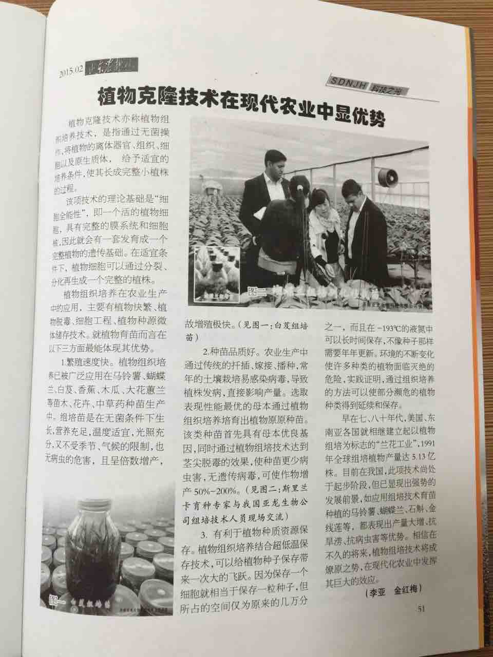 濟南亞龍生物以精湛的植物組培技術(shù)獲得該期刊和廣大客戶青睞,并在《山東農(nóng)機化》2015.02期成功發(fā)表文章,文章題目為《植物克隆技術(shù)在現(xiàn)代農(nóng)業(yè)中顯優(yōu)勢》(點擊左側(cè)標題查看全文)。感謝大家的關(guān)注和支持!